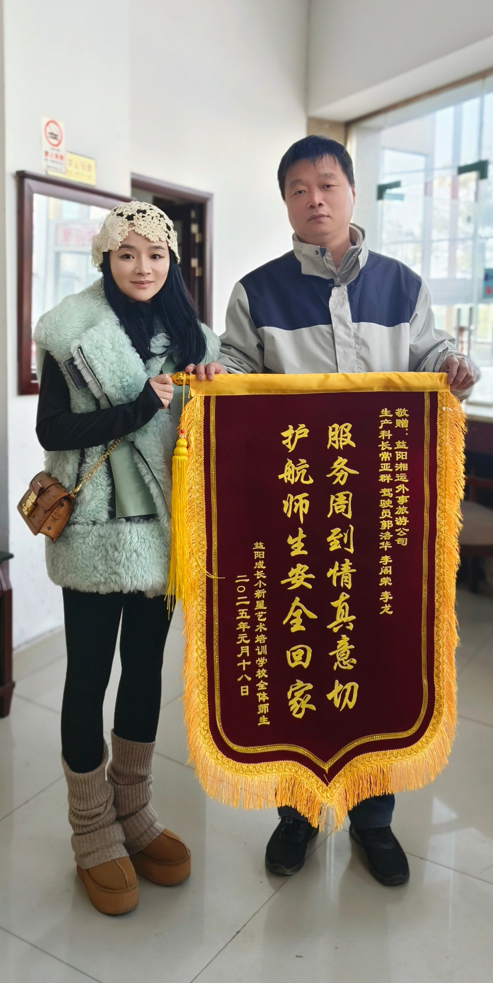 1月18日,益陽成長小新星藝術(shù)培訓(xùn)學(xué)校負責人到外事旅游運輸分公司送上“服務(wù)周到情真意切,護航師生安全回家”的錦旗。這是她們感謝公司生產(chǎn)科長常亞群以及駕駛員郭洛華、李閣榮、李龍的貼心服務(wù)。